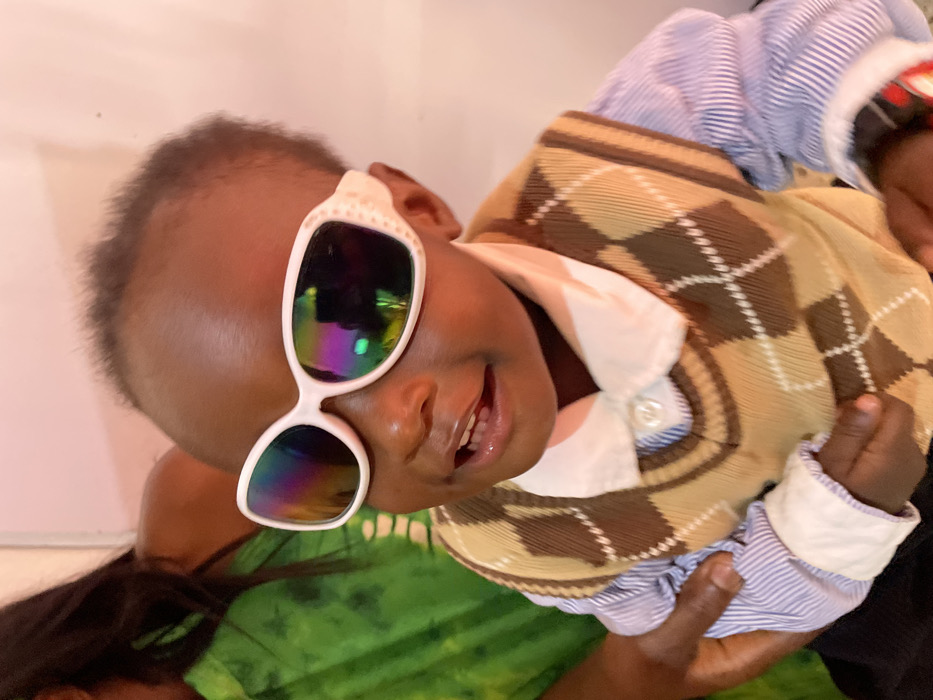 A dark-skinned child with a slight smile wears oversized white sunglasses with reflective lenses