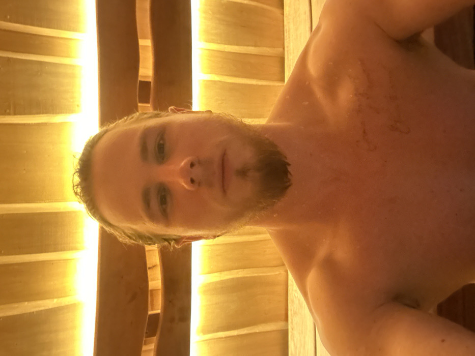 A shirtless man with fair skin and a light beard sits in a sauna