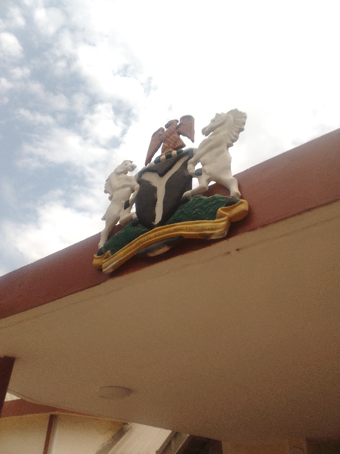 The image displays a low-angle view of the Nigerian Coat of Arms affixed to the exterior of a building in Jos, Nigeria