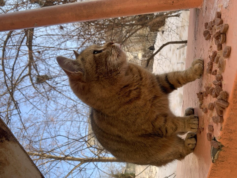 - "A tabby cat with brown and orange striped fur stands on an orange-colored ledge or railing" by FM-BI1Cp2, licensed under CC BY 4.0
