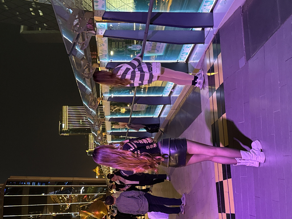 The image displays an urban night scene on a pedestrian walkway in Chaoyang District, Beijing, China. The ground is predominantly illuminated by purple light, with sections of black and yellow checkered tiling. In the foreground, a woman stands with her back to the camera, featuring long, light brown hair. She is dressed in a black cut-out long-sleeve top, a black leather mini-skirt with a studded belt, and white combat boots. To her right, a second woman, also facing away, has long brown hair and wears a grey and white striped oversized sweater, light-colored tights, grey athletic shoes, and carries a small white quilted shoulder bag. She is positioned near a modern railing system composed of glass panels internally illuminated with blue light and topped with reflective, angular canopies. In the left background, a small group of pedestrians is visible, including a man in a plaid shirt and a woman making a "peace" sign. The wider background reveals numerous tall, illuminated skyscrapers, with a distinct grid-patterned building prominent on the far right.