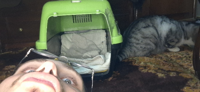 A low-angle selfie shows a face with sunglasses. Behind it, a green and black pet carrier is open, with a blanket inside. To the right, a gray and white cat is curled up, resting on a brown and tan patterned carpet. The scene is dimly lit, with a dark wooden surface in the background.