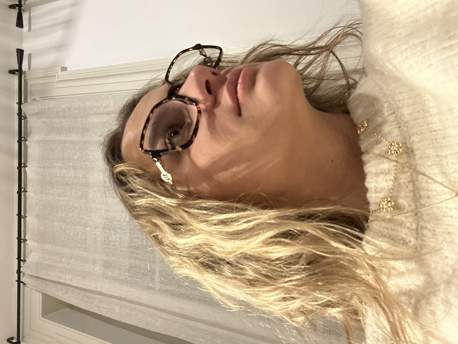 A woman with blonde hair wearing glasses poses in an upward-facing view