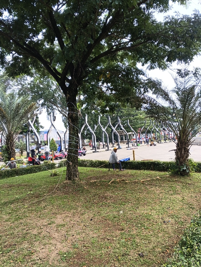 The image depicts a public park or square in Ho Chi Minh City, Vietnam, under an overcast sky. The foreground consists of a gently sloping grassy area with patches of bare earth. A large tree with a dark, textured trunk and dense green canopy dominates the left-center of the foreground; white string or wire is wrapped spirally around its trunk. Behind a low, trimmed green hedge, a wide, paved plaza extends into the midground. On the left side of this plaza stands a palm tree with a thick trunk and green fronds. Several people are present on the paved area. To the left, a group, including children, are seated on small, brightly colored ride-on toy vehicles, specifically a red and a pink one. Towards the right, a male individual wearing a light-colored hoodie, dark trousers, and a yellow cap is seated on a low bench or stool, facing away from the viewer and looking towards the right side of the plaza. A yellow pole with a dark base is visible near him. Along the far perimeter of the paved plaza, a series of identical, tall, stylized white and black arcing sculptural structures are evenly spaced, forming a distinctive architectural feature. Further in the background, more trees and urban buildings are visible through the foliage.