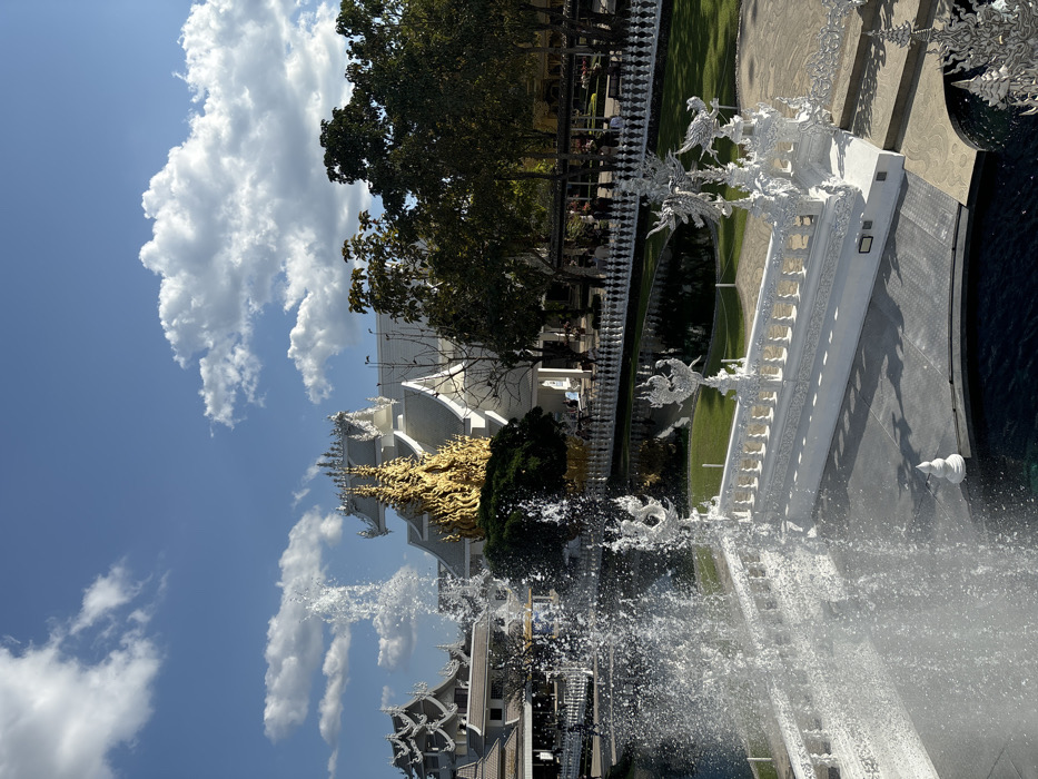 The image depicts a sunlit exterior view of Wat Rong Khun, commonly known as the White Temple, located in Ban Rong Khun, Chiang Rai Province, Thailand. In the foreground, a powerful fountain sprays white water upward from a dark pool, partially obscuring a white, intricately decorated bridge or walkway. This structure features numerous balusters and ornate mythological creature sculptures, appearing to be white Nagas or similar figures, on its railings. In the midground, a serene, dark-water pond reflects the surrounding sky and structures. A pristine green lawn borders the pond, beyond which a white, ornate fence separates the lawn from a paved pathway. Numerous individuals, appearing as small figures due to distance, are visible walking along this pathway. Behind them, a line of dense green trees casts shadows, indicating direct sunlight from the upper right. In the background, distinctive white temple buildings with multi-tiered roofs and elaborate gables are prominently featured. One central building displays a large, golden, flame-like sculptural element rising from its base. Other white buildings with similar architectural characteristics are visible further to the left. The sky is bright blue with scattered white cumulus clouds. The overall scene is well-lit, with strong highlights on the white structures and clear shadows from the trees and buildings.