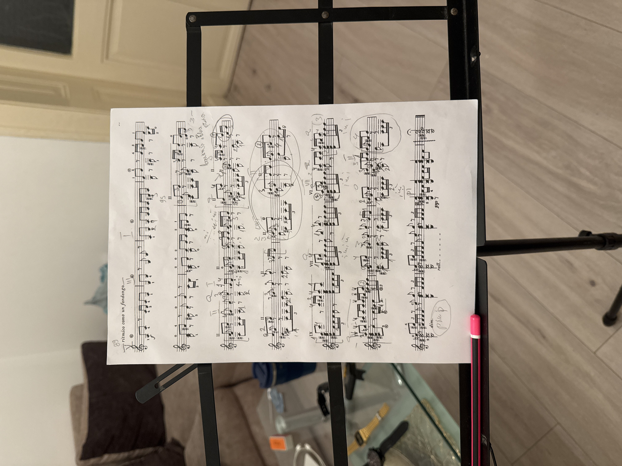This image shows a music sheet with annotations on a black metal music stand