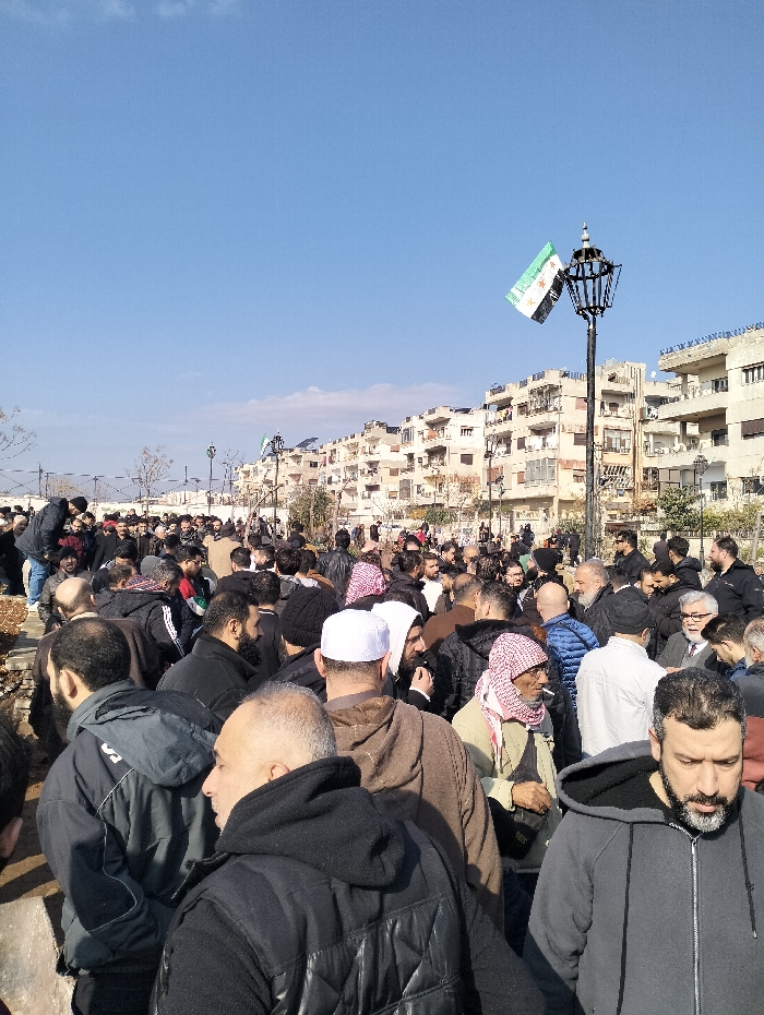 This image depicts a dense outdoor gathering of adult males under a clear blue sky in an urban environment. A large crowd of men, primarily dressed in civilian winter jackets and hoodies, occupies the foreground and mid-ground. Some individuals wear traditional head coverings such as white prayer caps or red-and-white keffiyehs. In the mid-ground right, a black, ornate metal lamppost stands prominently, from which a Syrian opposition flag (horizontal green, white, and black stripes with three red stars) is displayed. Behind the crowd, a continuous row of multi-story residential buildings with multiple windows and balconies lines the horizon, indicating a city setting. Sparse deciduous trees are visible in the left mid-ground. One man in the mid-ground is observed smoking a cigarette. The presence of the Syrian opposition flag identifies the location as an area within the city of Homs, Syria, historically associated with the Syrian opposition. The specific district or street is not discernible from the visual information.