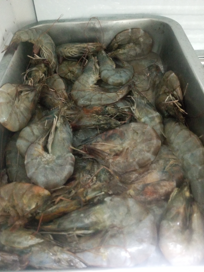 - "A metal tray overflows with raw shrimp, exhibiting varying sizes and shades of gray" by FM-p7z193, licensed under CC BY 4.0