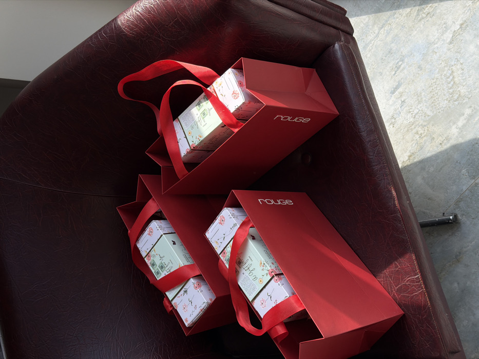 Three red paper gift bags containing floral-patterned boxes are situated on a dark brown, possibly leather, armchair