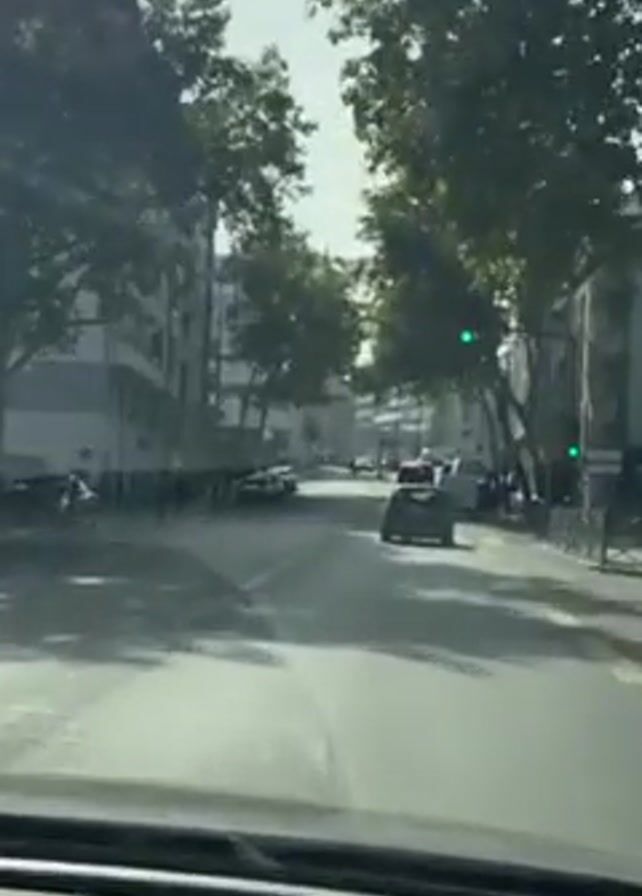 car driving down a city street. The street is lined with buildings and trees. There are parked cars on both sides of the street. Pedestrians are walking on the sidewalks. A church can be seen on the right side of the street. The sky is bright, and the sun is shining.