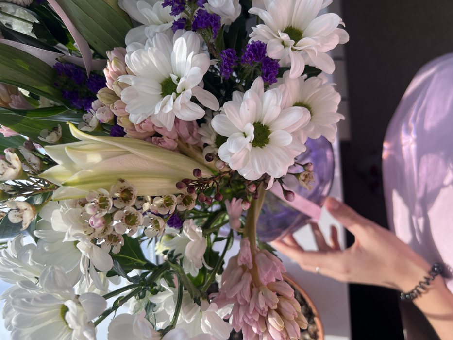 A vibrant bouquet features white daisies with green centers, complemented by delicate white wax flowers with hints of pink. Lavender hyacinths and small clusters of purple blooms add depth to the arrangement. A light green lily bud provides a focal point. The flowers are presented in a clear vase with a pink ribbon. A person's hand with a simple ring and a spiral hair tie is visible near the vase. The scene is bathed in soft, natural light.