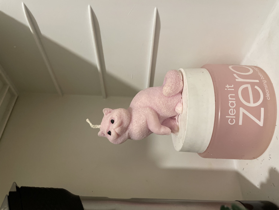 The image depicts an indoor scene featuring a pink, cat-shaped candle positioned atop a cosmetic jar