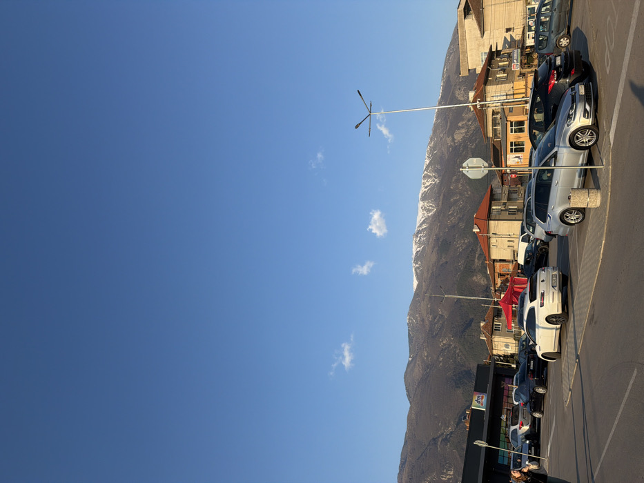 The image displays an outdoor scene in Karlovo, Bulgaria, under a clear blue sky with sparse cumulus clouds. The foreground consists of a paved parking lot occupied by numerous parked vehicles, including a white Volkswagen Arteon shooting brake, a silver Volkswagen Golf variant, a dark BMW sedan, and various other cars. A red canopy structure is erected within the parking lot. A street light pole with multiple fixtures and a circular traffic sign on a pole are centrally located in the mid-ground. To the left, a large, dark building featuring a visible "dm" store logo is present. One individual, partially visible on the far left, walks away from the viewer. Behind the parking lot and adjacent buildings with reddish-brown tiled roofs, a prominent mountain range with visible snow on its upper sections extends across the horizon. The lighting suggests late afternoon, with shadows cast to the left.
