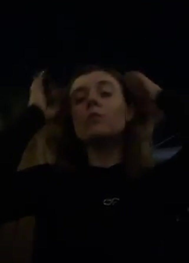 A young woman with light hair stands outside at night. She is wearing a black long-sleeved shirt. The woman looks directly at the camera and puts her hands behind her head, pulling her hair back. There is noise and chatter around her. The background is dark.