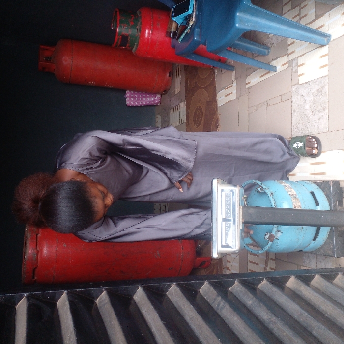 In the city of Ijotan, Nigeria, a female individual with dark hair tied back is depicted in a semi-sheltered area. She is wearing a long, grey, loose-fitting garment and dark green sandals. The individual is bending forward, focused on a silver-colored digital weighing scale with a black stand, upon which a light blue gas cylinder with visible wear is positioned. Her right hand is near the top of the cylinder. To the immediate left, a dark, vertically-slatted structure is partially visible. In the background, against a dark wall, stand two red gas cylinders of differing heights; the shorter one has a green top. A small pink polka-dotted object rests on the tiled floor between the red cylinders. To the right, a blue plastic stool holds a black smartphone and additional small objects. The floor is tiled with light-colored rectangular patterns, and a brown patterned mat is visible further back. The scene represents an individual weighing a gas cylinder at what appears to be a gas refilling or distribution point.