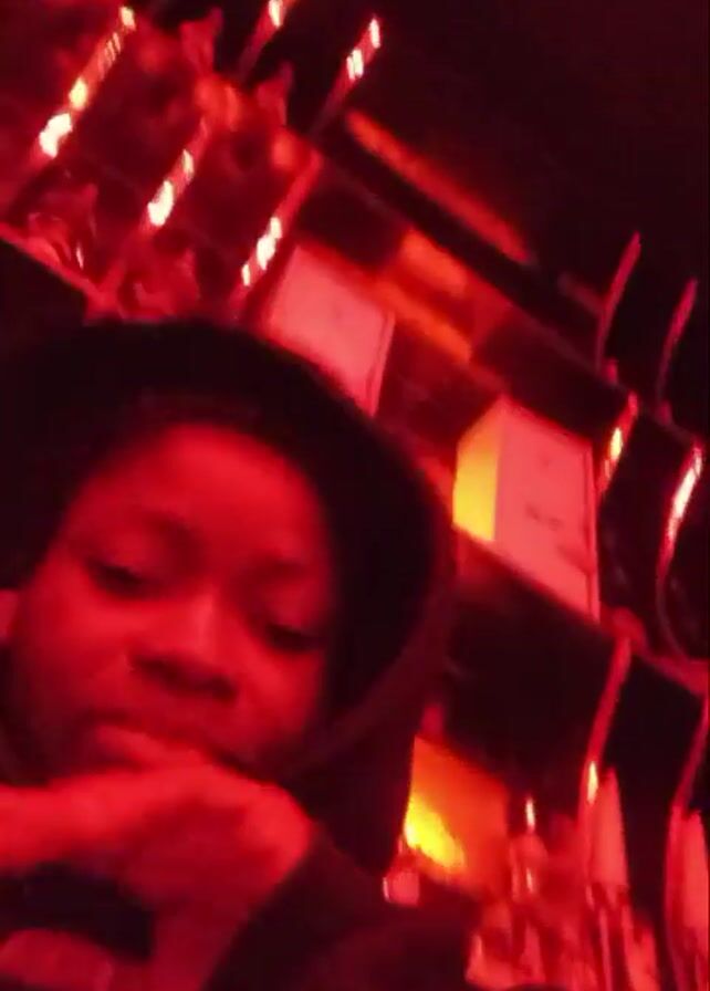 A young person is in a bar with red lighting. The young person is facing the camera and wearing a hoodie. There is a shelf behind the person stocked with bottles and boxes. The person is mouthing the lyrics to music and making gestures with their hands.