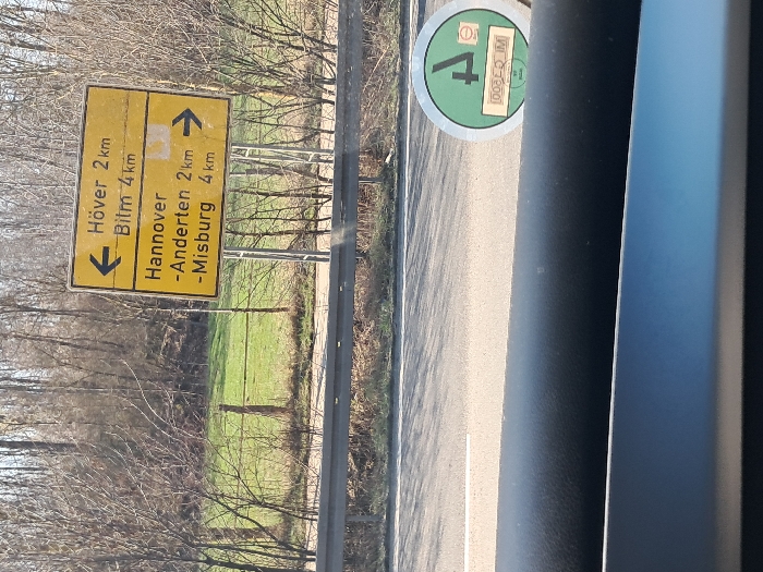 The image displays a roadside scene captured from inside a vehicle, looking towards a road and a landscape beyond. In the foreground, the upper edge of a dark vehicle dashboard or door panel is visible. On the lower right, partially obscured, is a circular green German environmental badge (Umweltplakette) with white text and symbols, viewed reversed through glass, bearing the partial inscription "WI_C3800". The primary subject is a yellow, rectangular German road sign with black text, mounted on two metal posts. The sign provides directional information: * The upper section indicates "Höver 2 km" with a left-pointing arrow and "Bilm 4 km" (without an arrow). * The lower section, framed under "Hannover," lists "-Anderten 2 km" and "-Misburg 4 km," both with right-pointing arrows. This sign is located on a road near the eastern perimeter of Hanover, Germany, providing directions to districts within the city (Anderten, Misburg) and to nearby villages (Höver, Bilm). Beyond the sign, a paved asphalt road surface is visible, marked with a solid white line on its edge. A metal guardrail runs parallel to the road. Behind the guardrail, a strip of green grass leads to a field, also green. The background consists of a dense cluster of bare deciduous trees, indicative of late winter or early spring. The scene is illuminated by direct sunlight, casting shadows and indicating clear atmospheric conditions. No individuals are present in the image, nor are any actions or interactions depicted.