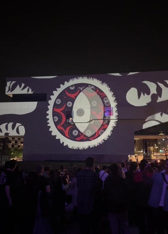 crowd of people at night watching images projected onto the facade of a modern building. The images include black-and-white symmetrical patterns, an eye-shaped design, and silhouettes of horses with floral motifs. The building has a modern, blocky design, and street lights are visible in the background. People in the crowd are standing, talking, and looking at the projections. Some are holding drinks. The sky is dark.