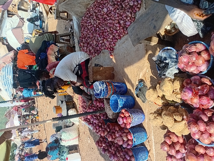 The image captures an outdoor market scene in Lokoja, Nigeria, under daylight