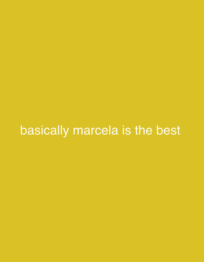 A mustard-yellow background features white text that reads "basically marcela is the best"