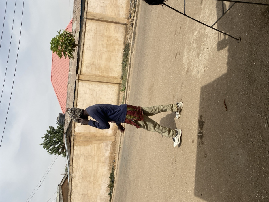 The image displays an outdoor street scene in Jos, Nigeria, under bright, hazy daylight conditions. An adult male is depicted walking from left to right across an asphalt road in the midground. He wears a mottled grey and brown beanie, a dark blue long-sleeved shirt, light-colored beige trousers, and white sneakers with dark accents. A vibrant, multi-patterned fabric in shades of red and yellow with dark designs is tied around his waist. He holds a dark-colored mobile phone to his right ear, appearing to be engaged in a call. In the background, a light beige concrete wall with vertical pilasters extends horizontally, topped by corrugated metal sheeting. Behind this wall, a building with a red corrugated metal roof is visible, along with a black plastic water tank on a stand to the left. A small, leafy green tree grows behind the wall, positioned centrally relative to the red roof. Overhead, thin power lines are visible against the pale sky. The foreground consists of the asphalt road, which displays a large, dark rectangular shadow cast from an unseen object to the left. A dark, elongated invertebrate, identified as a millipede, is visible on the road surface in the lower-right quadrant. A partial black metal tripod-like stand is present at the extreme right edge of the frame.