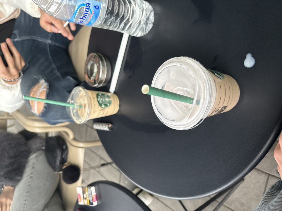 The scene depicts an outdoor cafe setting in Varna, Bulgaria, with multiple individuals seated at two black, round tables. In the immediate foreground, a Starbucks cold beverage cup, filled with a light brown liquid and ice, topped with a clear plastic lid and containing a green paper straw, rests on the table. A small, light blue/white liquid spill is present on the table surface next to this cup. On the adjacent table, further in the midground, another Starbucks cold beverage cup with a green paper straw and a light brown drink is visible. Surrounding it are several items: a silver metallic ashtray containing a cigarette butt, a silver and black patterned cigarette lighter, a partially full plastic bottle of Devin-brand water, two packs of cigarettes (one "Marlboro Touch" and one "Parliament Aqua Blue"), and a white cigarette filter/paper. Two individuals are partially visible seated at the midground table. On the left, a person is seen from the waist down, wearing grey jeans and a dark, possibly faux-fur, garment. A black shoulder bag with a black pom-pom charm rests beside them. On the right, a person is seated, wearing blue ripped jeans and a white jacket. Their right hand holds a black smartphone, while their left hand is holding a lit or recently lit cigarette. The ground appears to be paved, and light-colored chairs are partially visible.
