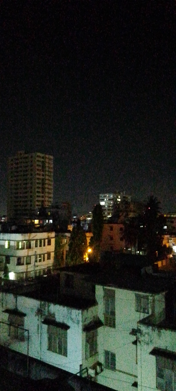 This image captures a nighttime urban landscape in Mombasa, Kenya, specifically depicting a view across multiple buildings under a dark sky. The foreground features the upper section of a light-colored, multi-story building, exhibiting some discoloration or weathering on its facade. This building has multiple rectangular windows, some with dark ledges or frames, and appears partially obscured by a dark, indeterminate structure at the bottom edge of the frame. In the mid-ground, a row of other buildings is visible. To the left, a multi-story building with numerous illuminated windows stands. To its right, several trees with dense foliage are interspersed with other structures, one of which emits a warm, bright light, possibly a streetlight. In the background, two prominent high-rise buildings pierce the skyline. The taller of these, on the left, is a multi-story structure with numerous illuminated windows, appearing light in color. To the right, another multi-story building also shows illuminated windows, though it is less distinct. The sky is dark, consistent with nighttime, and exhibits minor photographic noise. No individuals, specific actions, or vehicles are discernible within the frame.