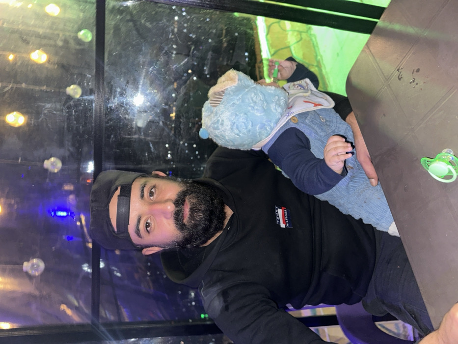 A man with a beard, wearing a black hooded sweatshirt and a black cap, holds a baby dressed in a blue denim outfit and a bib with a blue plush hat. They are indoors, possibly in a restaurant or enclosed area, with a table visible to the right. A green pacifier rests on the table. Background elements include decorative lighting and what appears to be a wall with reflective surfaces.