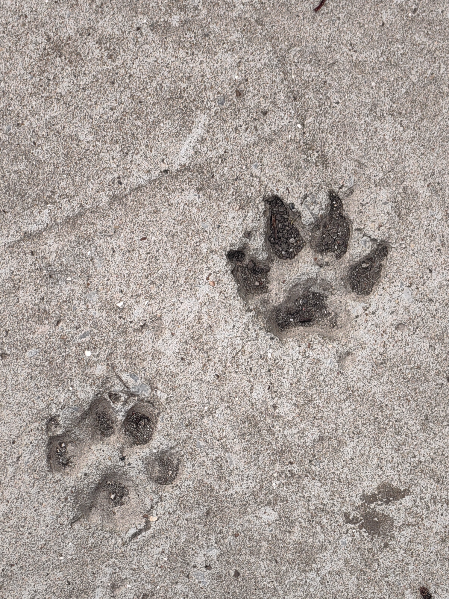 The scene depicts a coarse-grained, grey concrete surface located in Saedinenie, Bulgaria. Embedded into the concrete are two distinct animal paw prints. The larger print, situated in the upper right quadrant, exhibits five clear pad impressions and discernible claw marks, with the depressions containing dark, granular soil and small organic debris. A smaller, partially obscured paw print is present in the lower left quadrant, also showing five pad indentations filled with similar dark material. No human subjects or other discernible objects are present besides the concrete surface and the embedded prints.
