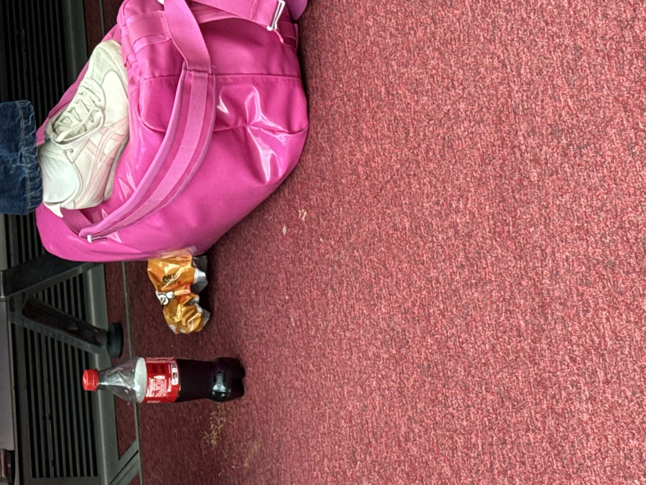 The image displays an indoor, low-angle view of a carpeted floor in Le Mesnil-Amelot, France. The primary surface is a mottled red, low-pile carpet, showing some scattered debris and lighter marks. In the mid-ground, a dark plastic Coca-Cola bottle with a red cap and label is positioned upright, approximately one-third full. To its right, a crumpled, orange and silver-lined snack bag lies on the carpet. Further right, a bright, glossy pink duffel bag is situated horizontally. A person's lower right leg, clad in blue denim jeans, is visible above the bag. Their right foot, wearing a white sock and a white athletic shoe with light pink accents, rests on the top surface of the pink duffel bag. In the background, a dark, horizontal metallic structure with visible slats is present, likely part of seating or a divider, with a grey surface beyond it.