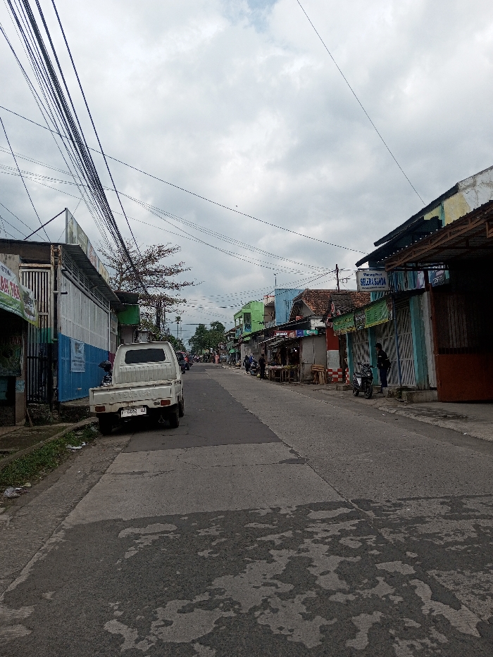 The image depicts a street scene in Khajuripada, India, under an overcast sky. The view is oriented down a two-lane asphalt road with visible patching and cracks. Numerous overhead utility lines crisscross the upper portion of the frame. On the left side of the road, a white Mitsubishi pickup truck, license plate P 8682 UJ, is parked partially on a dirt verge and concrete strip. The truck is facing away from the viewer. Behind the truck is a building with a white upper section and a blue lower facade. Further down the street, buildings with varied architectural styles and colors, including green, line the road. Sparse tree foliage is visible in the distance. On the right side of the road, a series of single-story commercial buildings or stalls are present. One building prominently displays a sign reading "Warung Makan SELERA SUNDA." Several individuals are visible standing and walking along the right sidewalk in the middle ground. A black motorcycle is parked near one of the shops on the right. The overall environment suggests a commercial area with local businesses.