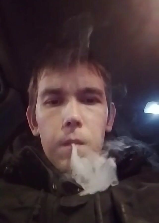 A video shows a man in a dark car with his head visible from the chest up. He has short brown hair and is wearing a dark jacket. He is exhaling a large cloud of vapor, possibly from a vape or electronic cigarette. A light is visible behind him through the car's rear window. Music is playing in the background.