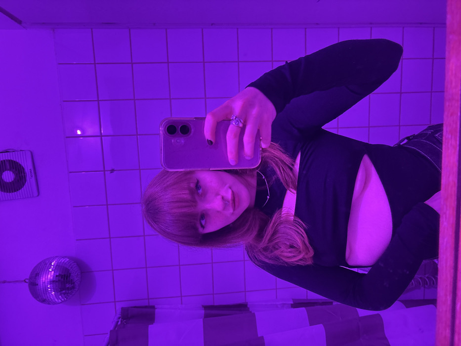 - "A woman in a black long-sleeved top with a chest cutout takes a selfie in a tiled bathroom with purple lighting" by FM-3J1Ls2, licensed under CC BY 4.0