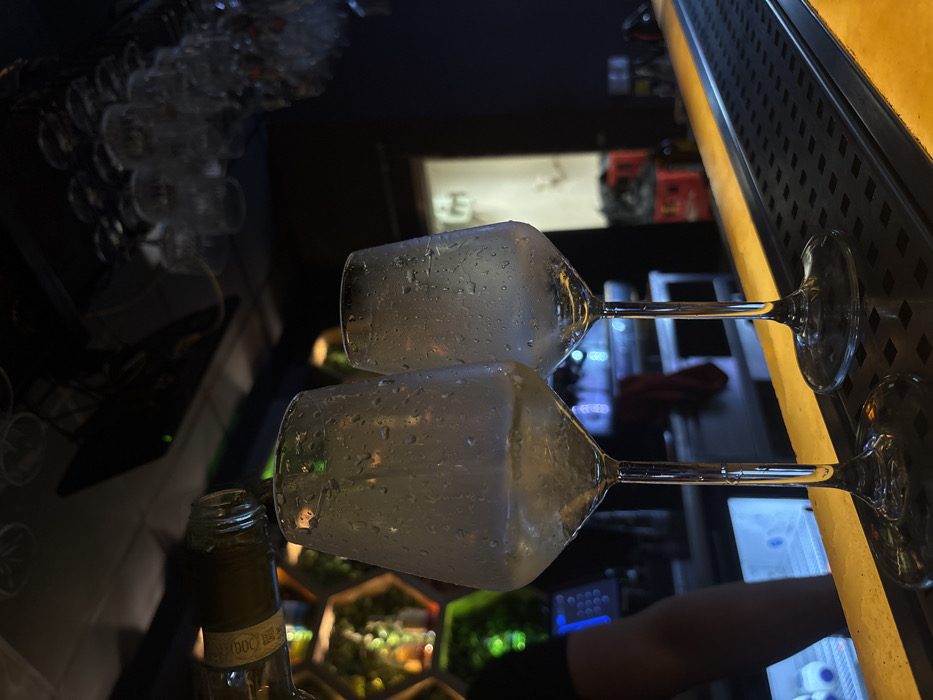 The scene is an interior shot of a bar or restaurant in Dupnitsa, Bulgaria. Two clear, stemmed wine glasses, exhibiting condensation and water droplets, are positioned on a black rubber bar mat which rests on a glowing yellow bar top. A light-colored liquid is actively being poured into the left glass from a dark bottle, a portion of which displays a "DOC" label. The right glass contains a similar light-colored liquid and is also frosted. A person's left arm, wearing a dark sleeve, is visible on the far left, indicative of the individual pouring the drink. The background is dimly lit, featuring hanging inverted glassware (wine glasses and tumblers). To the left, hexagonal shelving units with internal green illumination contain plants or bottles. A digital interface or point-of-sale system with blue backlighting is partially visible. Further in the background, red crates are present near a dark doorway. The overall environment is characterized by low light, with localized accent lighting in yellow, green, and blue.