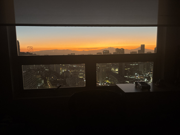 The image displays a panoramic view of Mexico City, Mexico, observed from an interior high-rise window during sunset or twilight