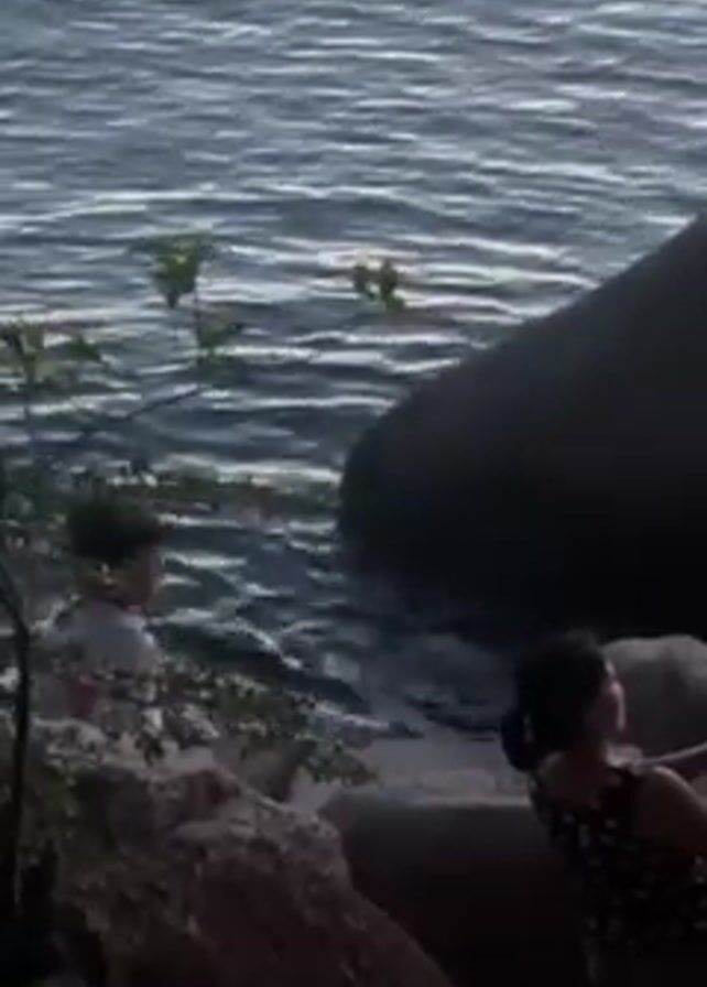 Two individuals are positioned on a rocky shoreline alongside a body of water. The person on the left is partially obscured by foliage, while the person on the right is visible, seated on a rock. A large boulder lies near the water's edge. The water itself shows gentle ripples.