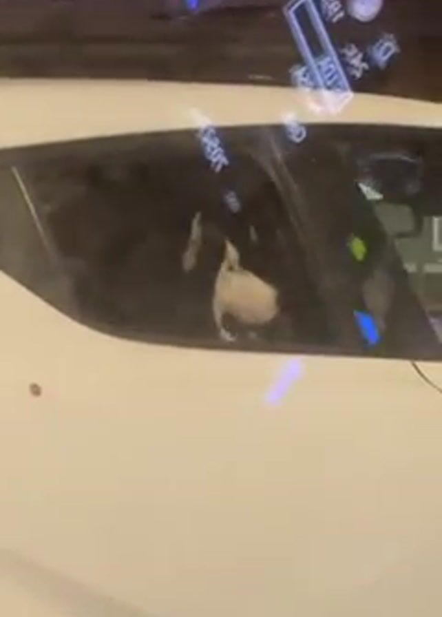 white car parked at night. The passenger side of the car is visible, including the rear window. Inside the car, a husky dog is visible through the window, barking. The dog's head is visible and its mouth is open in a barking position. In the background, there are blurred lights. The video is a close-up shot of the car and the dog.