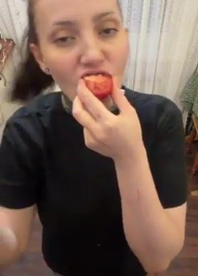 A woman wearing a black t-shirt is taking a bite out of a tomato. She has fair skin, a nose ring, and a neck tattoo. Her hair is pulled back into a ponytail. The video is filmed from a high angle, looking down at her. Behind her are white curtains and a glimpse of a kitchen area with wood flooring. There is pop music playing in the background.