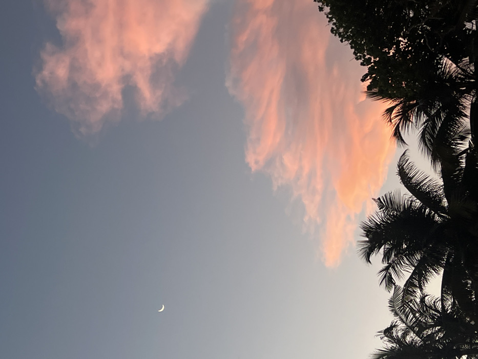 The image depicts an outdoor scene in Thalaramba, Sri Lanka, during either dusk or dawn. The upper two-thirds of the frame consists of a clear sky, transitioning from a light blue at the top to a lighter, more muted blue-grey near the horizon. A slender, white crescent moon is positioned in the upper-left quadrant of the sky. In the mid-right and upper-right portions, prominent clouds are illuminated with distinct pink and orange hues. The lower third of the image features the dark silhouettes of tropical vegetation, including multiple palm trees with visible fronds across the left and center, and a section of a denser broadleaf tree on the far right. No individuals, artificial structures, or specific actions are visible within the frame.