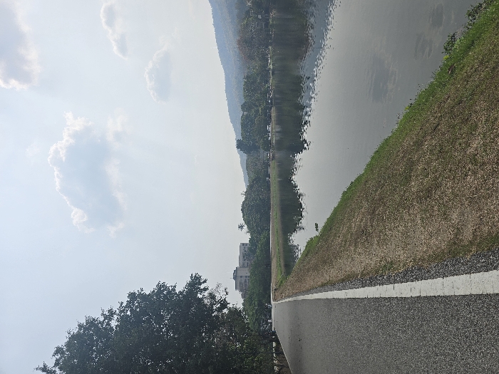 The image depicts an outdoor, daytime scene in Suthep, Thailand, featuring a body of water bordered by a paved path and an embankment. In the foreground, a dark gray asphalt path runs along the left side of the frame, marked by a distinct solid white line on its right edge. Immediately adjacent to the path, a grassy embankment slopes downwards towards a calm body of water, likely a lake or reservoir. The grass on the embankment appears a mix of dry, light brown, and green patches, particularly closer to the water. The water, appearing dark gray, occupies the midground on the right, reflecting the sky and distant trees with subtle ripples on its surface. Beyond the water, a line of dense green trees stretches horizontally across the scene. In the background, a light-colored, multi-story building with a flat roof is visible above the treeline on the left. Further to the right, a range of forested hills or mountains rises under a bright, hazy sky. The sky is predominantly light blue to off-white, featuring several scattered white cumulus clouds, one large and prominent in the upper center-right. No individuals, animals, or vehicles are present in the observable scene. The environment is static, capturing a tranquil landscape view.
