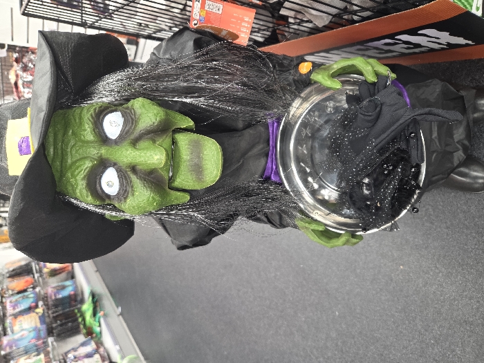 A Halloween witch decoration, featuring a green face with glowing white eyes, a prominent nose, and textured skin, stands in a retail store aisle in Caen, France