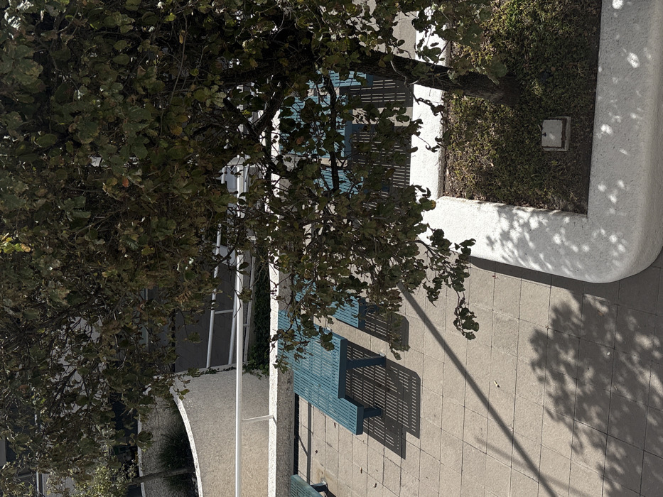 This image depicts an unpopulated outdoor communal area in Heroica Puebla de Zaragoza, Mexico, observed from an elevated perspective under direct sunlight. A mature tree with dense green-brown foliage occupies the upper right portion of the frame, casting extensive shadows onto the ground. Beneath it, a white, textured, L-shaped concrete planter contains the tree's base, sparse green ground cover, and a small, square, light-colored object, likely a utility cover. The ground is paved with light-gray square tiles, which show distinct, elongated shadows from the tree and other structures. Two teal-colored picnic tables, each constructed with slatted surfaces and integrated benches, are positioned on this paved area. One table in the mid-ground left exhibits strong, parallel striped shadows beneath its slatted top and seats. A second similar table is partially visible to the right, largely obscured by tree foliage and shadows. In the background, a curved, white concrete wall or planter contains minimal vegetation. Above and beyond this wall, a white metal handrail is visible, extending horizontally. Portions of a light-colored building with dark window openings are discernible in the far background. The bright lighting indicates a clear, sunny day.