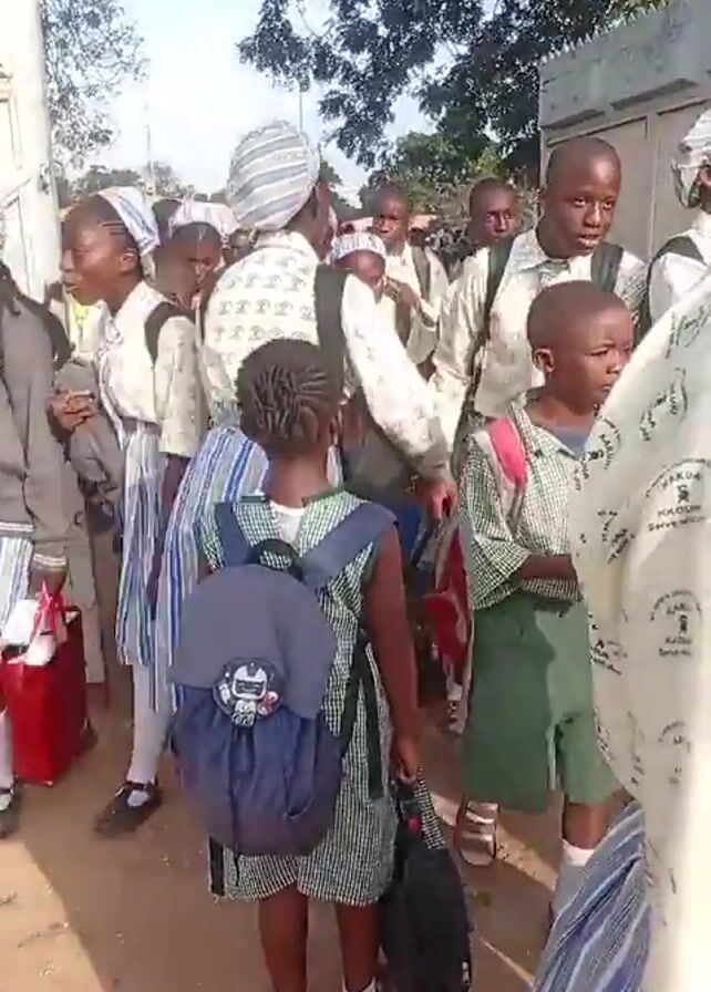 A group of school children stand outside on a sunny day. Most of the children are wearing school uniforms. The uniform includes a white shirt with a pattern on it, a blue and white striped bottom, and a blue and white headscarf. Some of the children are also wearing ties that match the striped bottoms. They have backpacks. Some of the children are holding papers. A couple of the older children are talking and smiling at the camera. There are trees in the background.