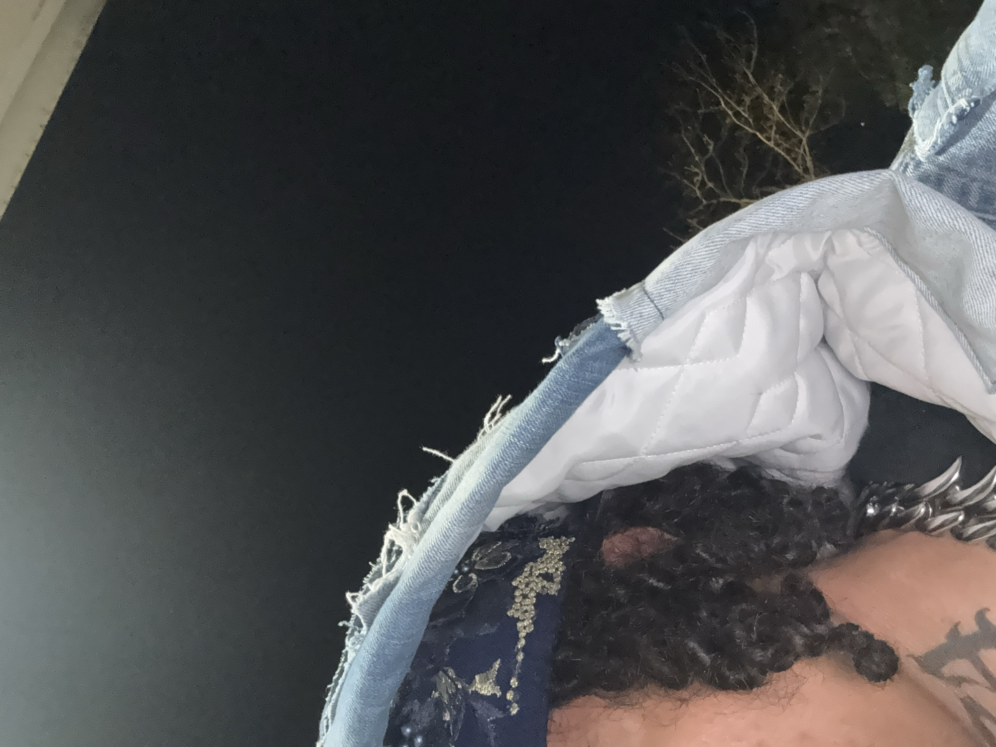 The scene, located in Massy, France, depicts a close-up, angled view of an individual's head and upper torso during nighttime. The subject has dark, curly hair, styled in braids or dreadlocks, and a dark, patterned tattoo visible on the neck. They are wearing a blue bandana embellished with silver-toned details, positioned under the hood of a light blue, distressed denim jacket with a white quilted interior. A heavy metallic chain necklace with pointed links is visible around the neck. The background is predominantly dark, featuring a faint silhouette of bare tree branches on the right and an indistinct lighter edge in the upper frame.