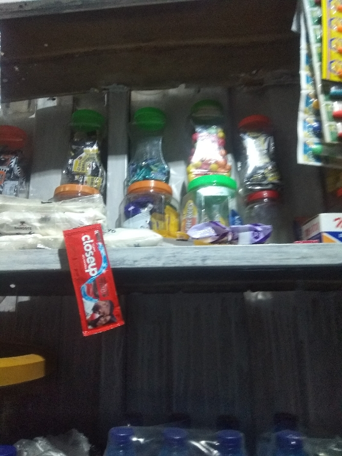 A dimly lit store shelf displays an assortment of items. Several plastic jars, some with green and others with orange or red lids, contain various candies or snacks. A red tube of "Closeup" toothpaste leans against other items on the shelf. Wrapped candies, bags of white powder, and other small goods are also visible. The shelf is made of metal and the background is a dark, vertical panel. Bottles of water are seen on the bottom shelf.