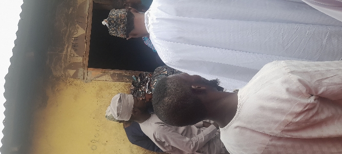The scene is set outside a building in Toto, Nigeria, featuring a discolored mustard-yellow wall with dark staining and faint decorative patterns, including triangles, around a dark, open doorway. A corrugated metal roof is visible at the top. In the foreground, facing away from the viewer, are two men. The man on the left wears a light-colored long-sleeved garment and has short dark hair with a beard. The man on the right wears a white flowing garment and a dark, intricately patterned cap. In the midground, to the left of the doorway, a third man is partially visible in profile, wearing a light grey long-sleeved garment and a matching cap, looking towards the right. Behind him, an individual with a dark, patterned headscarf is partially obscured. Another individual in dark attire is partially visible to the right of the doorway. The group of at least five individuals appears to be standing or congregated near the building's entrance; no specific actions or direct interactions are discernible beyond their collective presence.