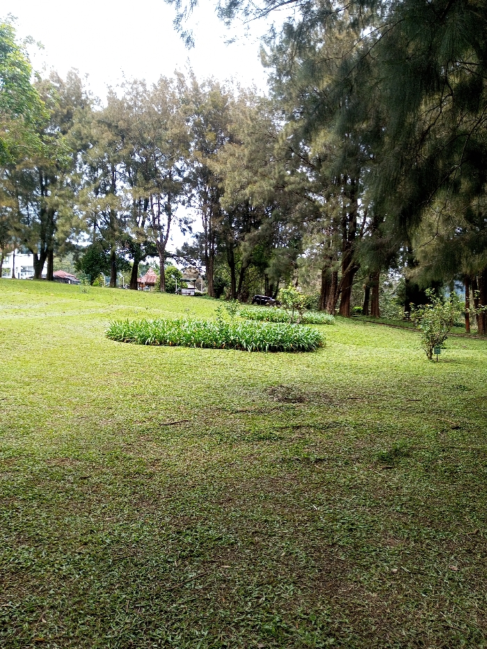 Lush green lawn with varied shades, stretches across the frame. A circular patch of leafy plants sits midway, surrounded by open grass. Tall, slender trees line the horizon, their branches reaching skyward. A small structure is visible amidst the trees in the background. Light filters through the canopy, creating shadows and highlights on the ground. The scene conveys a sense of tranquility and natural beauty.