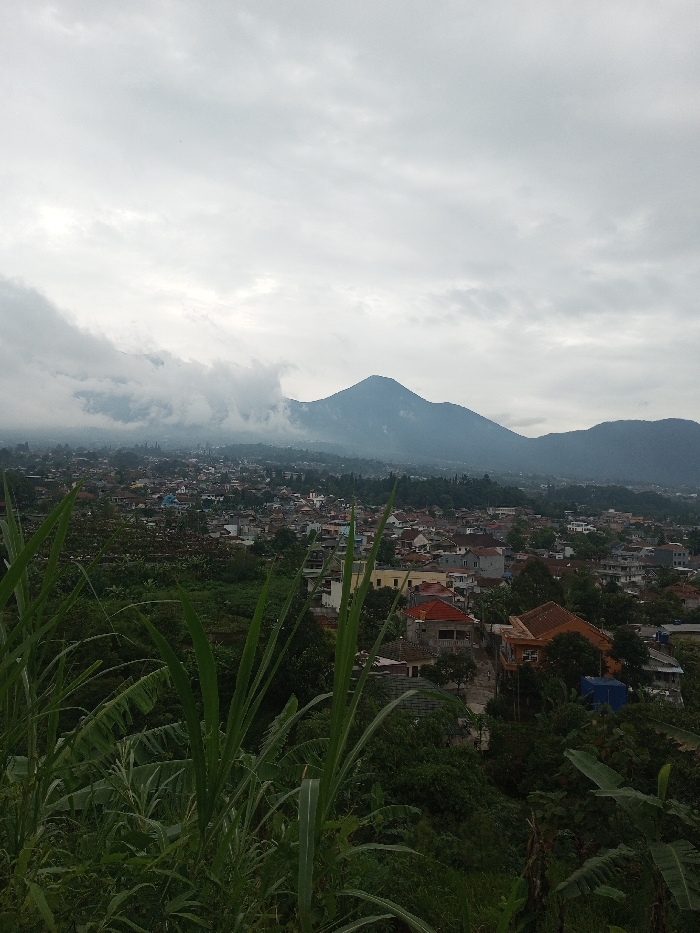 An elevated panoramic view captures a densely populated urban area situated before a mountainous backdrop under an overcast sky, purportedly located in Bhupalpally, India. In the immediate foreground, a dense array of uncultivated green vegetation is present, characterized by tall, slender, pointed leaves on the left and center, and broader, flatter green leaves further to the right. This vegetation partially frames the bottom portion of the scene. The midground reveals an expansive urban settlement comprised of numerous multi-story structures. Buildings display varied architectural styles and roof colors, including orange, red, and grey, indicating a mix of residential and potentially commercial properties. The structures are tightly clustered, interspersed with green trees and foliage. No distinct individuals, vehicles, or specific human activities are discernable within the urban sprawl due to the elevated perspective. The background is dominated by a range of mountains or large hills. The most prominent mountain, centrally located, exhibits a distinct peaked profile. Extensive cloud cover or mist partially obscures the lower and mid-slopes of these mountains. The sky overhead is heavily overcast, presenting a uniform expanse of grey and white clouds.