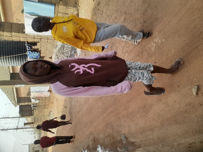 The image depicts an unpaved, reddish-brown dirt path in a residential area of Bauchi, Nigeria, under a bright, hazy sky. Four individuals are walking on the path. In the foreground, a young dark-skinned individual wears a brown hooded sweatshirt with pink sleeves and a pink deer head logo, patterned knee-length shorts, and flip-flops. To their right and slightly behind, a second young dark-skinned individual wears a yellow hooded sweatshirt with an indistinct logo, light grey trousers, and dark flip-flops, holding a small light-colored object in their left hand. In the mid-ground, walking away from the viewer, a third dark-skinned person wears a red long-sleeved shirt and dark trousers. Behind them, a fourth dark-skinned person in a dark maroon top and lower garment carries a dark handbag. The background features low-rise concrete block buildings, some with corrugated metal roofs. A large black plastic water tank is visible on the right. Laundry hangs on walls bordering the path, and electrical poles with wires are present in the distance. Minor debris, including small rocks and a wet patch, are visible on the path.
