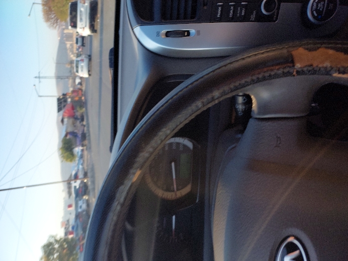 Inside a car, the view through the windshield reveals a street lined with vehicles, pedestrians, and buildings. A light blue sky tops the scene. The car's dashboard and steering wheel dominate the foreground. The steering wheel shows signs of wear and tear. The dashboard features a radio and various controls. A speedometer is visible, positioned behind the steering wheel. The car's logo is subtly displayed on the steering wheel's center.